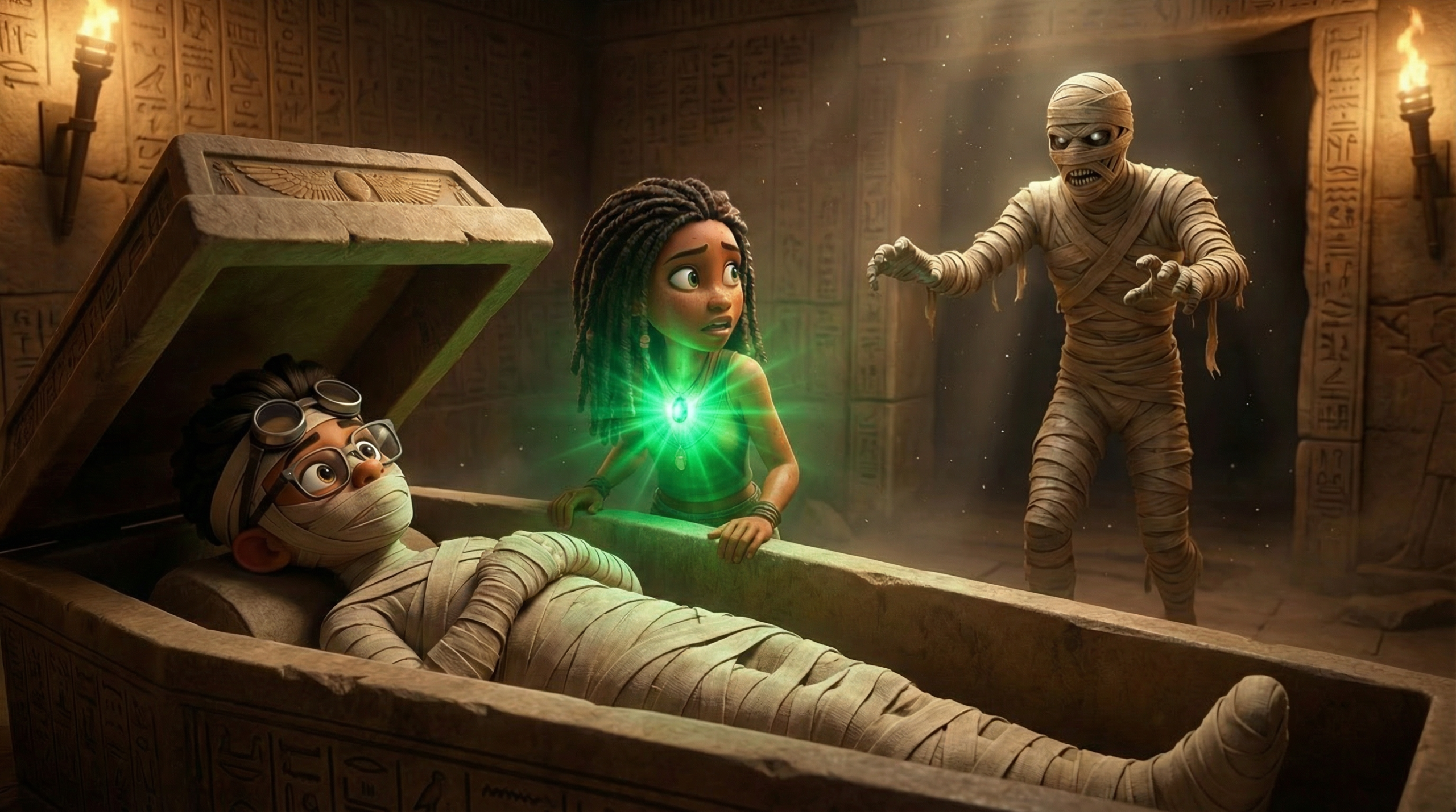 the curator finds the two sarcophagi empty and the mummies missing. Amara has a hunch the